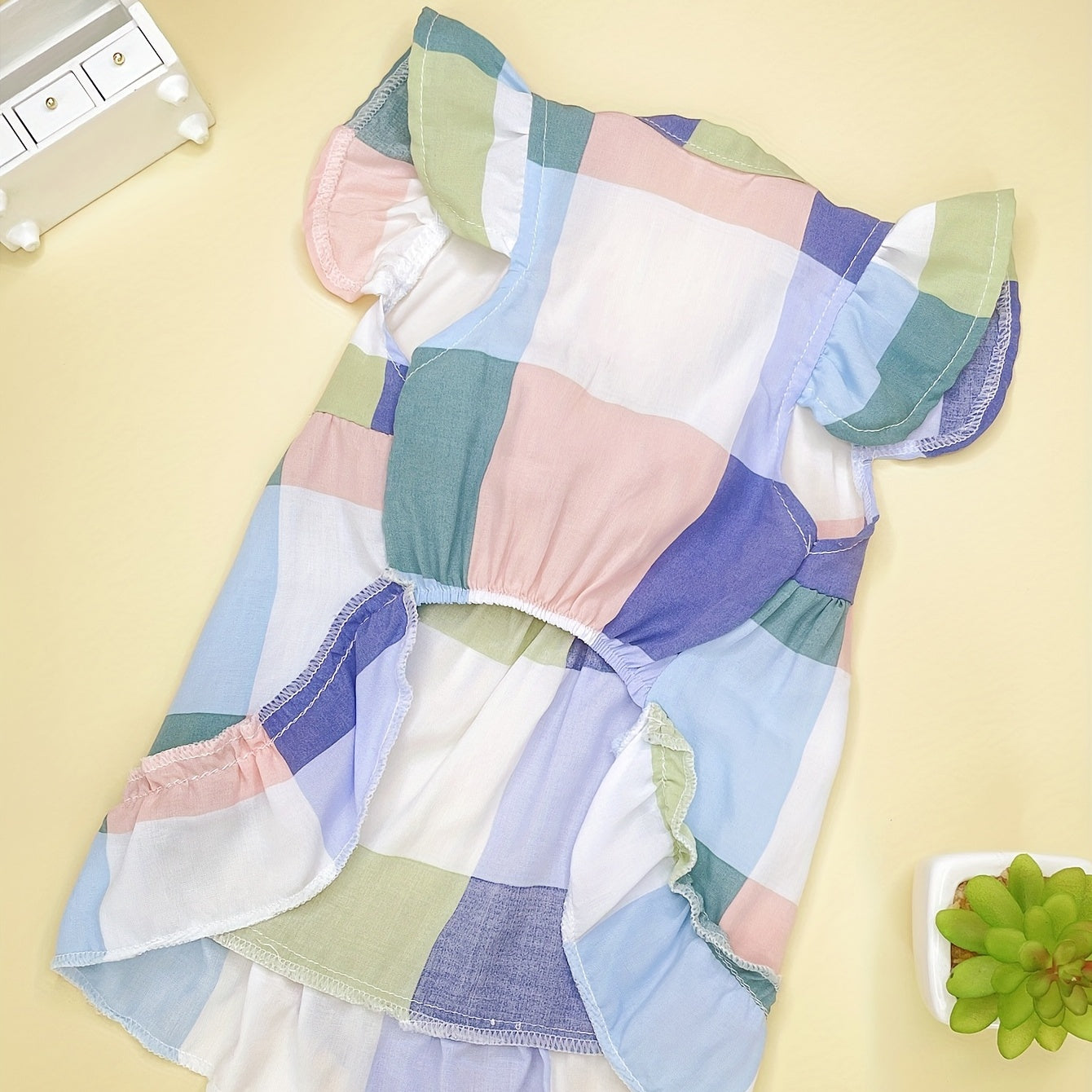 1pc Pet Breathable V-Neck Ruffle Sleeve Plaid Dress with Tie, Polyester Woven Pullover for Small to Medium Breeds, Dog and Cat Home Vacation Style Outfit, Home Leisure Attire | Playful Pet Outfit | Durable Pet Dress, Pet Clot